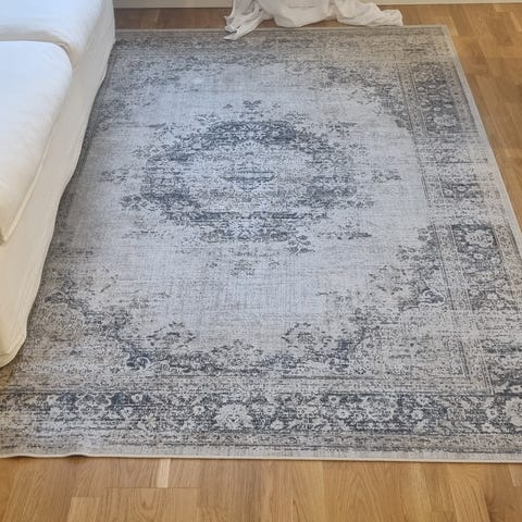 IKEA matta i grå nyanser med mönstrad design. Rektangulär modell som passar bra under soffgrupp eller matbord. Textilmatta som ger en mjuk yta på golvet och dämpar ljud i rummet. Lämplig för användning i vardagsrum eller andra bostadsutrymmen.