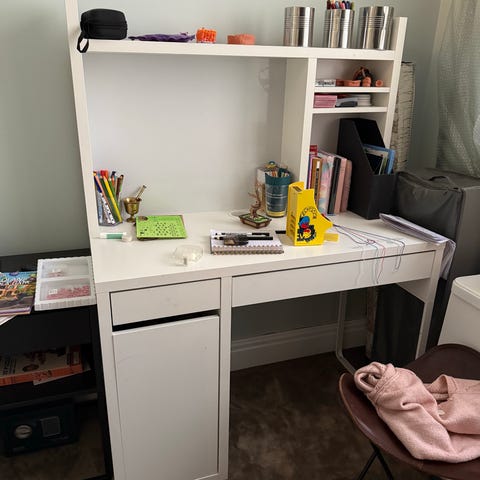 Skrivbord med stol. Sonen har målat på skrivbordet så får målas över eller täckas.