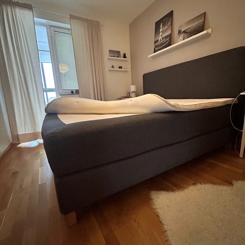 Skick: Mycket bra skick. Hel och ren bortsett från några repor på två hörn, se bild. Madrasskydd och sängkappa har alltid använts som skydd.