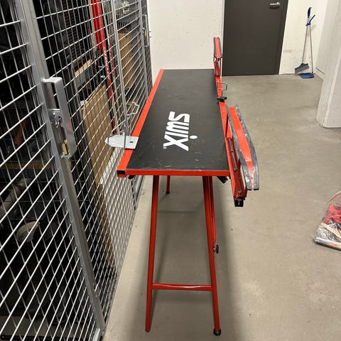 Swix vallabord i röd och svart färg. Stabilt bord med hopfällbara ben anpassat för vallning och service av skidor. Bordet har en lång arbetsyta med plats för skidor och tillbehör. Passar för användning i vallabod, garage eller andra utrymmen där man behöver en stadig arbetsplats för skidvård. Inkluderar vallaprofiler.
