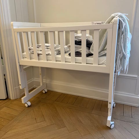 Vi säljer vår bedside crib från Troll i fint använt skick. Sängen har hjul, är höj och sänkbar och ena sidan går att fälla ner helt.