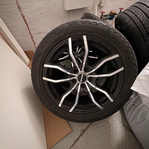 En fälg saknar centrumkåpa, på den fälgen finns en skada se bild, annars är de fina. Alla dubbar finns kvar i däckena som har förvarats mörkt i källarförråd