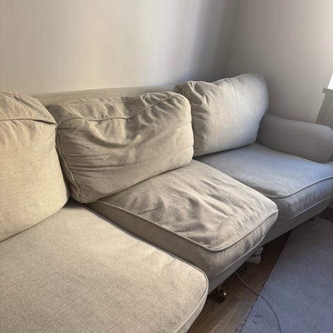 Inköpt 2023 för ca 13.500kr. Beige Manchester tyg. Inga fläckar eller liknande tecken på slitage.