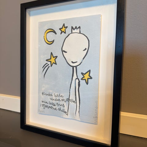 Tavla med väggkonst föreställande ett flygplan på blå bakgrund, en liten figur på en hylla och en pratbubbla med texten "I should have booked all those flights...". Motivet är inramat i en enkel träram och passar som dekorativ väggdekoration i hem eller kontor. Ingår plexiglas skydd.