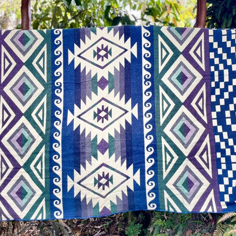 Mönstrat tyg med geometriskt motiv i turkosa, beige, bruna och vita toner. Passar till exempel för sömnad av blus eller linne.