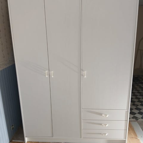 Inredd med klädstänger, hylla samt utdragbara trådkorgar.
