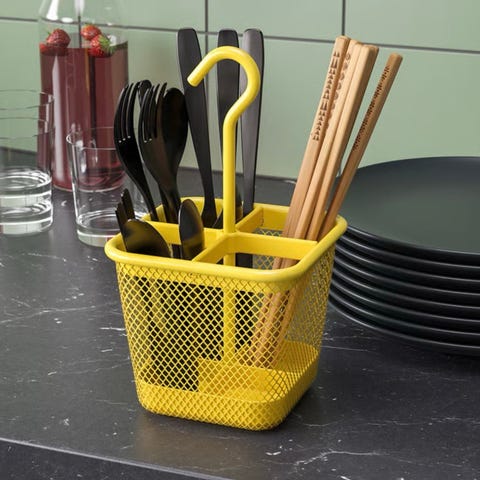 Diskställ i metall i grå färg. Övre delen består av ett galler för tallrikar, glas och bestick. Under finns en perforerad bottenplatta som samlar upp vatten. Fristående modell som kan placeras på köksbänk eller annan plan yta.