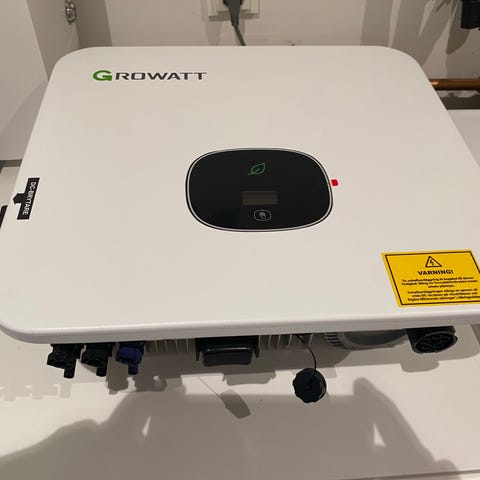 Growatt växelriktare för solcellsanläggning. Enheten omvandlar likström från solpaneler till växelström för användning i hushåll eller anslutning till elnätet. På sidan finns teknisk märkning med information om effektdata, spänning, ström och säkerhetsklassning. Lämplig som del i ett solenergisystem för bostad eller mindre anläggning. Exakta effekt- och modelluppgifter framgår av typskylten på produkten.