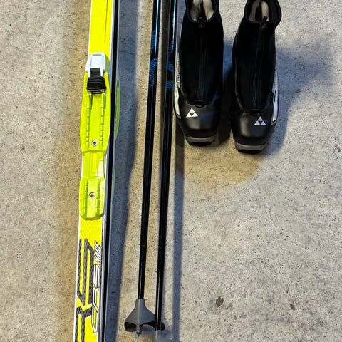 Fischer Sprint Crown längdskidor med tillhörande stavar och Madshus längdpjäxor.