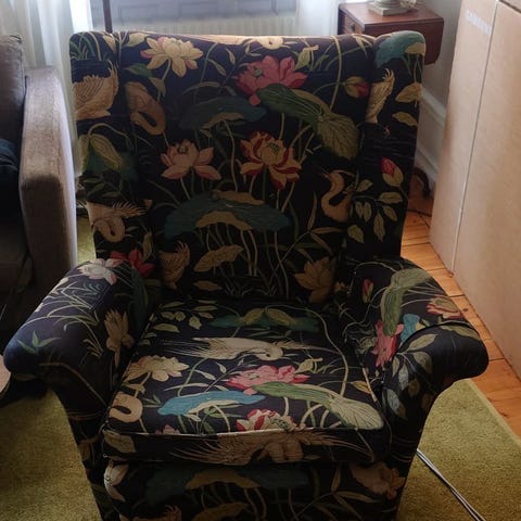 Fåtölj i modellen Djursholm från Englesson med tyg från Morris. Fåtöljen är solblekt på sittdynan, men är i bra skick i övrigt - hel och ren.