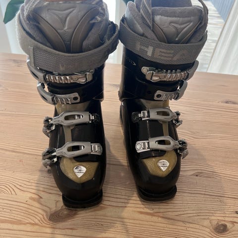 Salomon pjäxor med yttersula 297 mm, innersula 250 mm (storlek 39-40) Färgkombination i svart och guld med transparenta detaljer. Pjäxorna har fyra justerbara spännen per pjäxa och rem upptill för bättre passform runt vrist och vad. Invändigt finns vadderad och mjuk innersko för ökad komfort. Standard alpina bindningar. Använda men håller säkert för många åk till.