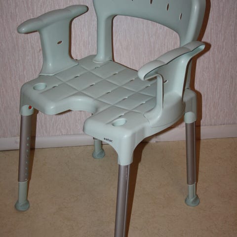Duschstol med ryggstöd och armstöd. Sits och rygg består av bruna plastlameller och stommen är i metall. Stolen har fyra ben med halkskydd för stabilitet i våtutrymmen. Lämplig att använda i dusch eller badrum för att ge stöd vid sittande hygienmoment. Nypris 1400kr. Uppackad och monterad men aldrig använd.