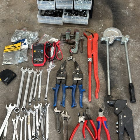 Diverse mek prylar, bygglampa,gersåg ,handverktyg,12 v dammsugare, 220v Polermaskin ,220v borrslip , 1 st oöppnad påse med 50st slangklämmor,220v våtkap m .m