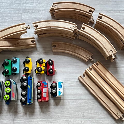 BRIO tågbana i trä med 55 kurvade och 13 raka rälsdelar, 2 brodelar och 2 bergselement. Flera färgglada tåg och vagnar ingår varav en är batteridriven (behöver byta batteri) samt små figurer och olika trafiksymboler och skyltar.