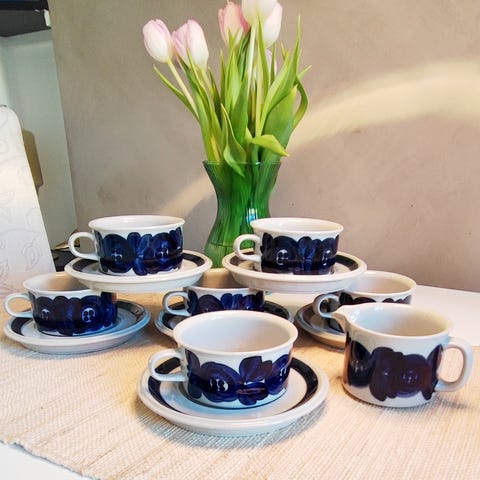 Oljekanna och två mockakoppar med fat