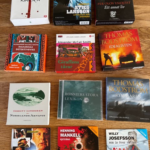 Samling med ljudböcker av blandade författare, främst kriminalromaner och deckare. På bilderna syns bland annat titlar av Jo Nesbø, Jussi Adler-Olsen, Leif GW Persson, Harlan Coben, Roslund & Hellström, Anne Holt, Åke Edwardson, Björn Hellberg och flera andra. Formatet är CD/mp3-skivor i originalfodral.