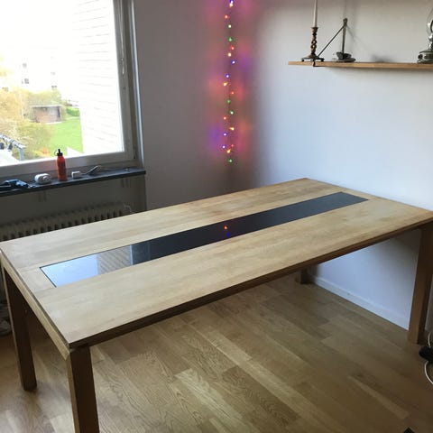 Massivt ekbord 180x90 cm +50 cm iläggsskiva. Bordet kan bli som nytt om man slipar topplagret. jag kan slipa av toppen för några hundralappar om så önskas.