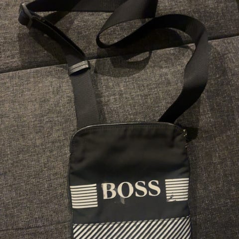 Tommy Hilfiger axelremsväska för man i svart fuskläder. Väskan har justerbar axelrem i textil och stängs med dragkedja upptill. Framtill finns en logodetalj med Tommy Hilfiger. Modellen är kompakt och lämpar sig för mindre tillhörigheter som plånbok, mobil och nycklar. Baksidan är slät utan fack. Insidan har huvudfack, övriga innerfack framgår inte av bilderna.