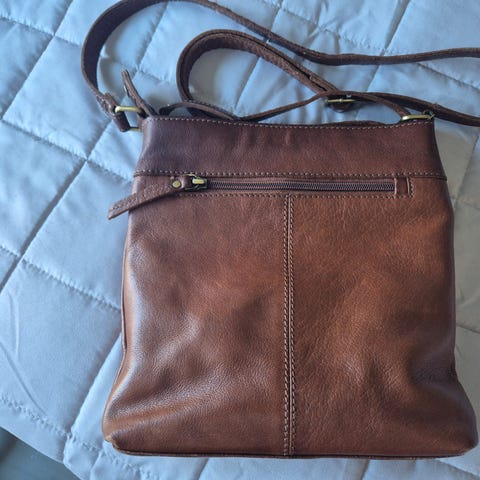Väskan har flera fack med dragkedja, både på framsidan och baksidan, samt ett huvudfack. Axelremmen är justerbar. Bredd citka 28cm och höjden cirka 23cm och djup cirka 13cm rem cirka 120cm.