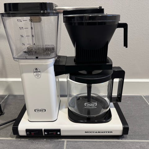 Moccamaster kaffebryggare i vit färg med svarta detaljer. Bryggaren har vattenbehållare på sidan, filterhållare ovanför kannplatsen och avtagbart droppgaller. Elsladd med stickkontakt ingår. Passar för bryggning av kaffe i hushållsmiljö. Exakt modellbeteckning och volym framgår inte av uppgifterna.