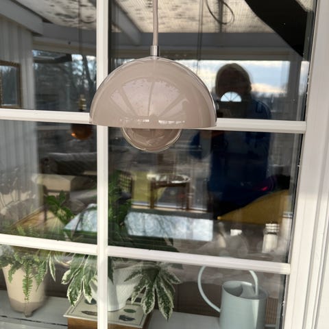 Vit ampel lampa med ljusterbar upphängning och bra ljus. Praktisk, snygg och stilren.