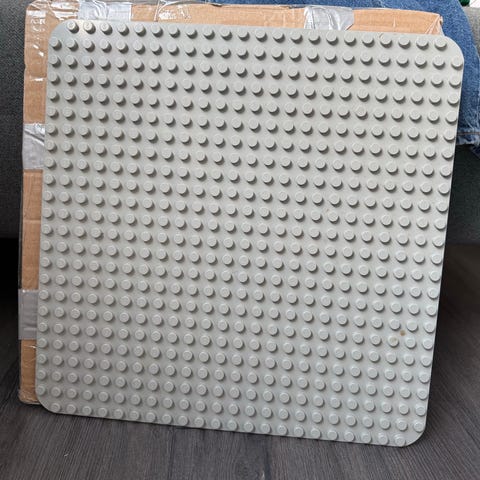 LEGO byggplatta i grå färg. Fyrkantig platta med studsar för montering av LEGO-klossar. Lämplig som bas för olika LEGO-byggen och som underlag för lek eller utställning av modeller.