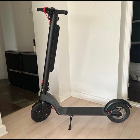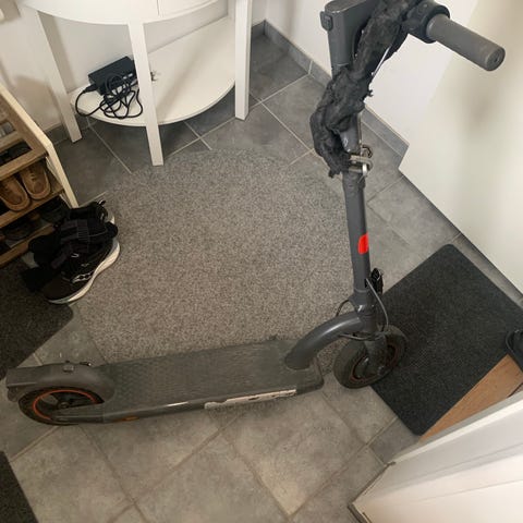 Elsparkcykel i svart färg. Modellen är hopfällbar och har handtag med bromsreglage samt display/enhet vid styret. Utrustad med fram- och bakhjul anpassade för stadskörning. Passar för kortare pendlingssträckor och vardagsresor på cykelvägar och jämna underlag. Laddare och tillbehör kan medfölja enligt bild, specifika tekniska data som räckvidd, motoreffekt och batterikapacitet är inte angivna.