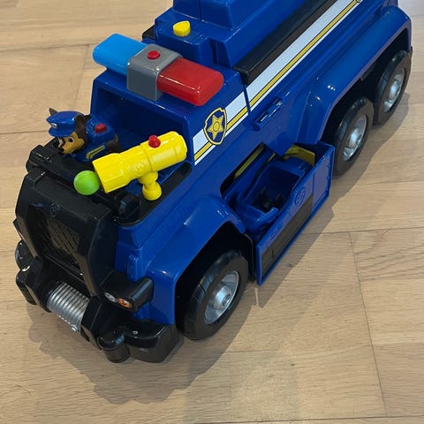 Paw Patrol leksaksfordon Chase bil och motorcykel i blå och vit plast. Större polisbil som kan öppnas framtill så att den mindre motorcykeln med Chase-figuren kan köras in och ut. Fordonet har detaljer som spoiler, ramp och färgmarkeringar i rött, blått och gult som blinkar och låter som en polisbil. Bilen kan skjuta iväg de gula mynten (3 st). Allting är komplett, fungerande och i bra skick.