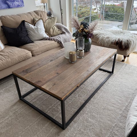 Stort fyrkantigt soffbord i måtten 115 x 115, höjd 30cm. Svartbetsad massivt trä.