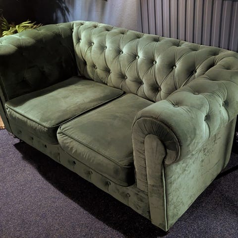 Soffa i mörkgrön sammet med plats för tre personer. Sittdel och rygg är stoppade med tjocka dynor och soffan levereras med lösa kuddar. Ben i mörkt trä med mässingsfärgade hjul framtill. Mått: bredd ca 222 cm, djup ca 100 cm. Passar som huvudsoffa i vardagsrum eller större rum där man önskar en djup och mjuk sittkomfort.