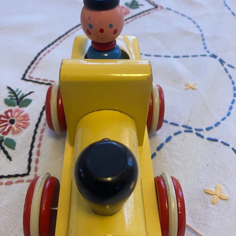Brio leksakskarusell i trä i flerfärgad design. Dragleksak med hjul, karuselltak i flera färger och små hästfigurer monterade runt mitten. Tillverkad i trä med målade detaljer och snöre framtill för att kunna dras längs golvet. Fungerande ringklocka och rullar bra. Märkt med Brio, Made in Sweden.