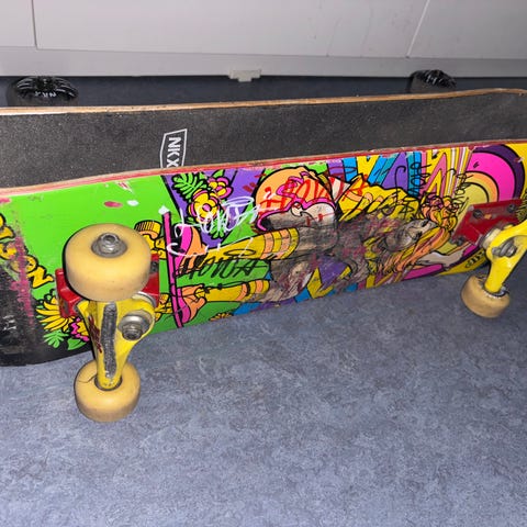 Skateboard cruiser med mönstrad deck i färgglad design. Brädan har rundad form med uppböjd nose och tail, samt fyra svarta hjul monterade på svarta truckar. Passar för åkning på jämnt underlag, exempelvis i stadsmiljö eller på cykelvägar. Lämplig för fritidsåkning för både ungdomar och vuxna beroende på längd och viktgräns för brädan.