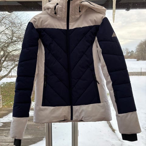 Skidjacka med snölås, kapuschong och tätslutande muddar i ärmslut. I mycket gott skick. Varm och välfungerande jacka i skidbacken.