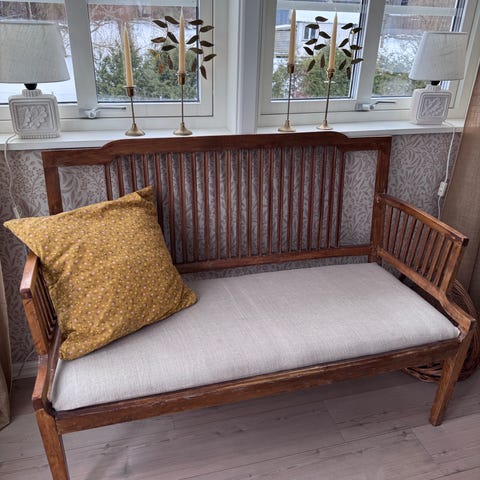 Rymlig kökssoffa Från 40 talet. Väldigt fint skick trots sin ålder. Blir dubbel djup när man drar ut den, bäddbar.