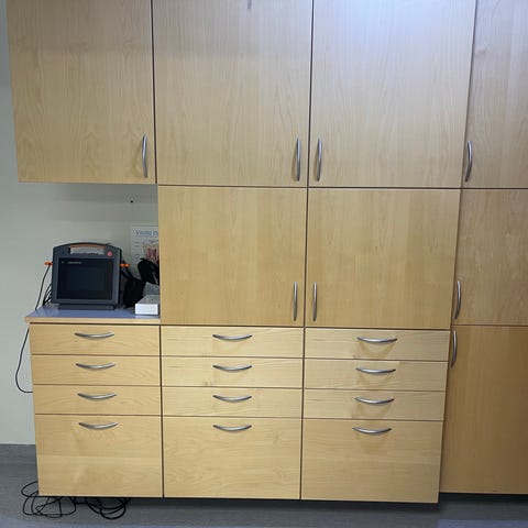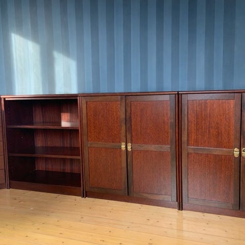 Förvaringsskåp i ljusbrun träfanér med flera nedfällbara luckor och lådor. Skåpen är modulära och kan ställas bredvid varandra för större förvaringsvägg eller användas var för sig. Passar för förvaring av pärmar, dokument eller annat kontorsmaterial. Neutralt utförande som lämpar sig för kontor, arkiv eller hemmakontor.
