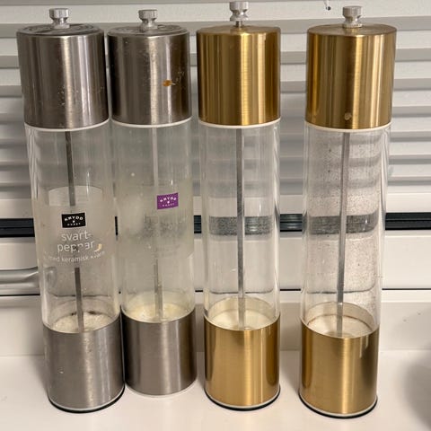 Stilrena salt- och pepparkvarnar i rostfritt stål och glas.
