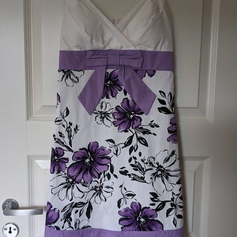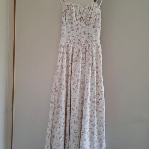 Vila sommarklänning för dam i storlek S. Klänningen är flerfärgad med blommigt mönster och är tillverkad i polyester. Modellen har lång ärm, markerad midja och volangdetaljer samt omlottinspirerad överdel med v-ringning. Passar som vardags- och festklänning under varmare säsonger.