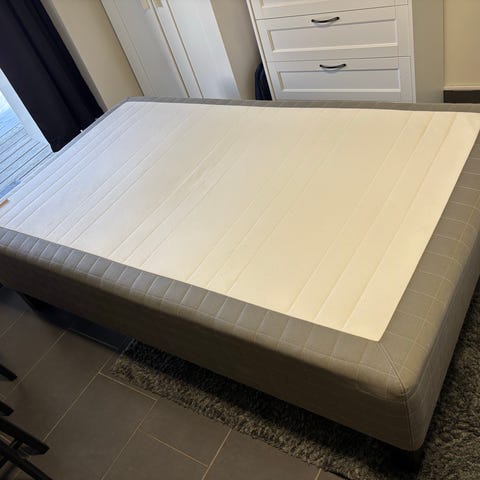 IKEA SKOTTERUD säng i grått utförande. Resårmadrass med övermadrass och ben. Sängen har ett vadderat, vågformat huvudgavel i ljus färg. Passar som enkelsäng i sovrum eller gästrum.