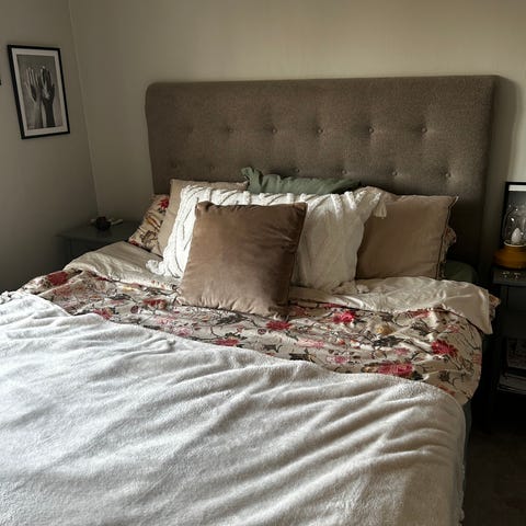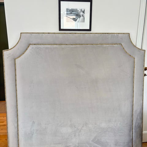 Passar som huvudgavel till säng och placeras mot vägg eller fästs enligt tillverkarens anvisningar. Materialkombination av textilklädsel och trästomme ger en stabil konstruktion med mjuk, vadderad yta mot huvudet.