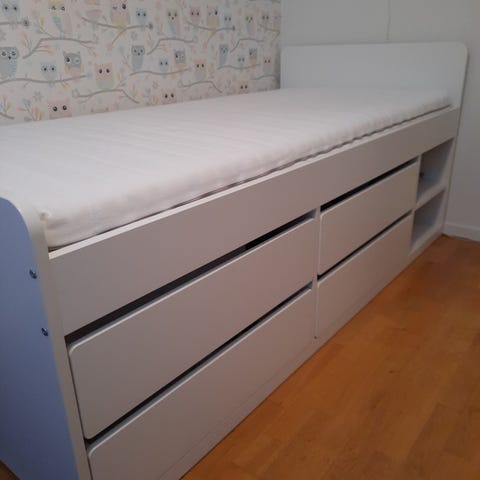 IKEA barnsäng med förvaring i vit färg. Sängen har ribbotten i trä och integrerad förvaring i form av flera lådor under liggytan samt öppna fack på sidan. Passar som juniorsäng eller barnsäng i sovrum eller barnrum. Mått enligt ritning: längd cirka 206 cm, bredd cirka 96 cm och höjd cirka 83 cm vid huvudgaveln. Tillverkad i träbaserat material med vit ytbehandling.