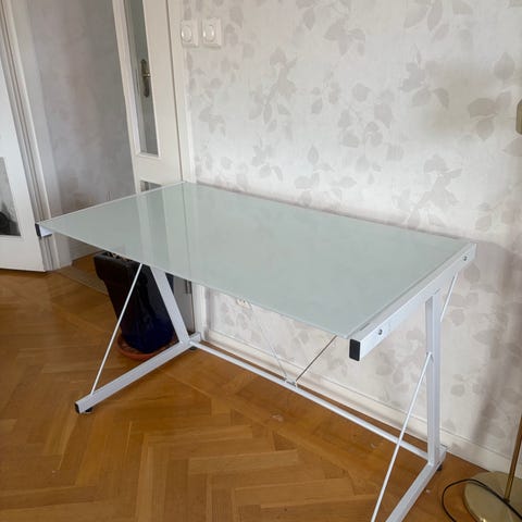 Skrivbord med skiva i glas och underrede i vitlackerad metall. Bordet har en rektangulär form med öppen stomme och en mindre hylla eller avlastningsyta under glasskivan på ena sidan.
