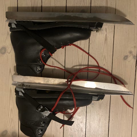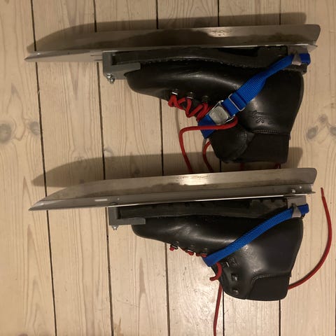 Långfärdsskridskor med fastmonterade läderkängor i storlek 37. Svarta kängor med snörning och röda remmar som fäster mot skridskoskenorna. Skenorna är långa och lämpar sig för allmän åkning på is, exempelvis sjöar eller isbanor.