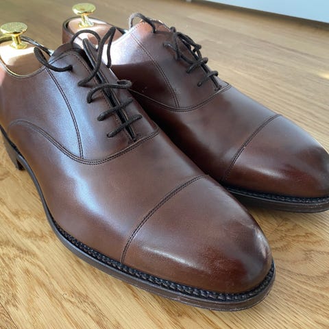 Ett par mycket eleganta läderskor/finskor, herrmodell, storlek 43. Handgjorda, inköpta i skobutik på Östermalm i Stockholm. Klassisk modell, med vackert mönster.