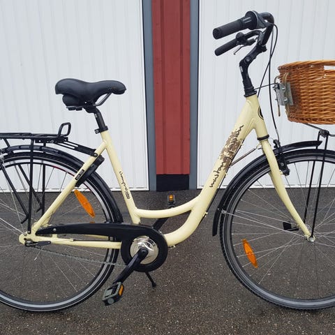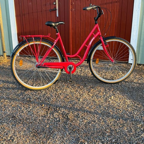 Yosemite damcykel med tre växlar. Har stått oanvänd under flera år och är felfri förutom några få lackskador. Har lite grövre däck och har mycket stabil ram.