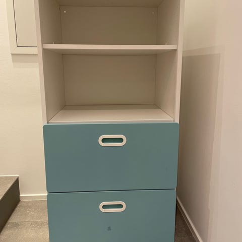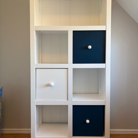 Vitt hyllhus i trä/träkomposit med flera öppna fack i olika storlekar. Översta delen är formad som ett hus med snedtak. Hyllan har både större och mindre fack som lämpar sig för förvaring eller exponering av till exempel leksaker, böcker eller prydnadssaker. Passar att ställa mot vägg i barnrum, vardagsrum eller hall. Hämtas i Hornstull.