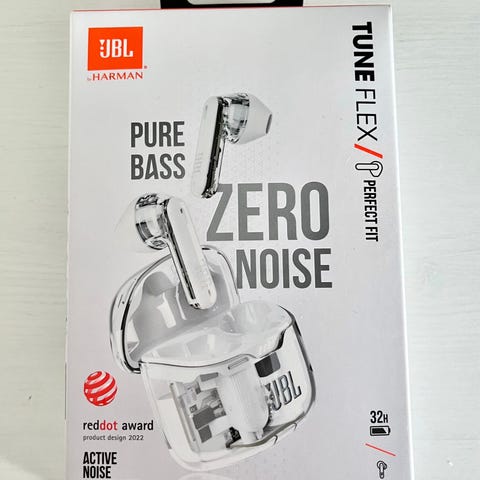 JBL trådlösa in-ear hörlurar med svart laddningsetui. Hörlurarna förvaras och laddas i det medföljande etuiet. Passar för användning med kompatibla mobiltelefoner, surfplattor och andra enheter som stödjer trådlös ljuduppspelning.