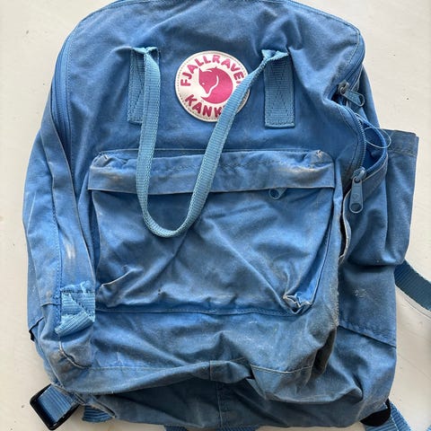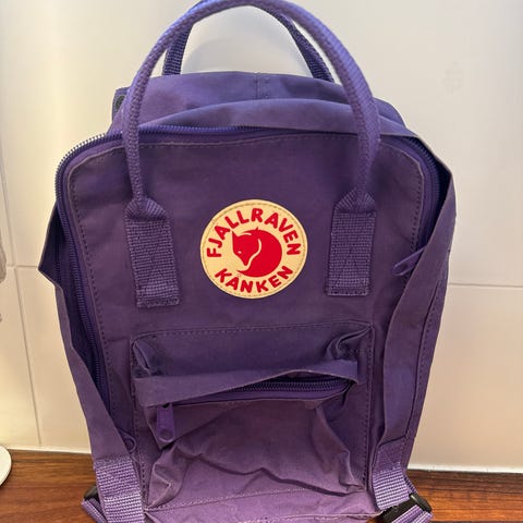 Fjällräven Kånken ryggsäck i tyg för unisex. Klassisk modell med huvudfack som öppnas med dragkedja, frontficka med dragkedja samt två öppna sidofack. Bärhandtag upptill och justerbara axelremmar. Färg: lila. Passar för vardagsbruk, skola eller fritid. Hel men inte ren.