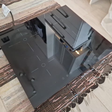 Ovansidan är i svart glas med markerade kokzoner och symboler för effekt- och temperaturreglering. Undersidan har fötter som lyfter hällen något från underlaget. Mått framgår delvis av bilderna med måttstock, inklusive höjd över golv/underlag.