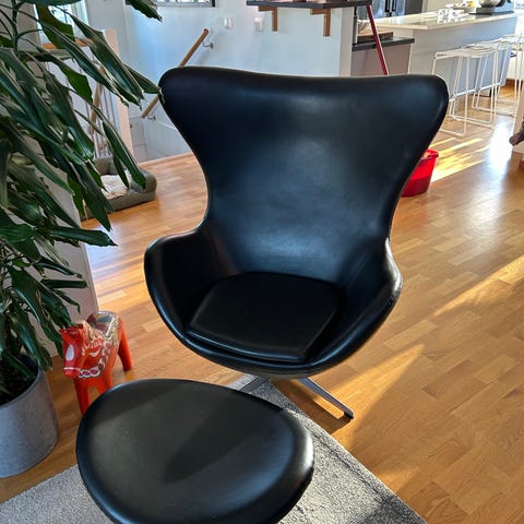 Replica äggfåtölj i svart anilinläder + fotpall