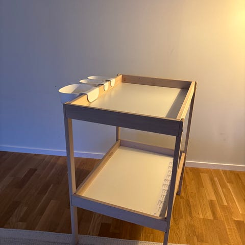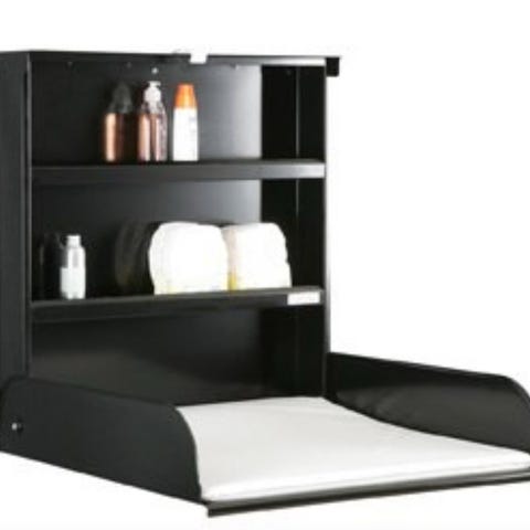 Mycket praktiskt och rejält skötbord av märket Brio Vegga. Vägghängt - fälls ut vid användning och fälls upp när det inte används och tar därför mkt liten plats. Praktiska hyllor för blöjor och tillbehör. Av lackerad plåt, vilket gör att det går bra att ha i badrum eller duschutrymme.